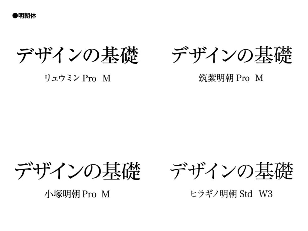 「リュウミン」「筑紫明朝」「小塚明朝」「ヒラギノ明朝」などがあります。