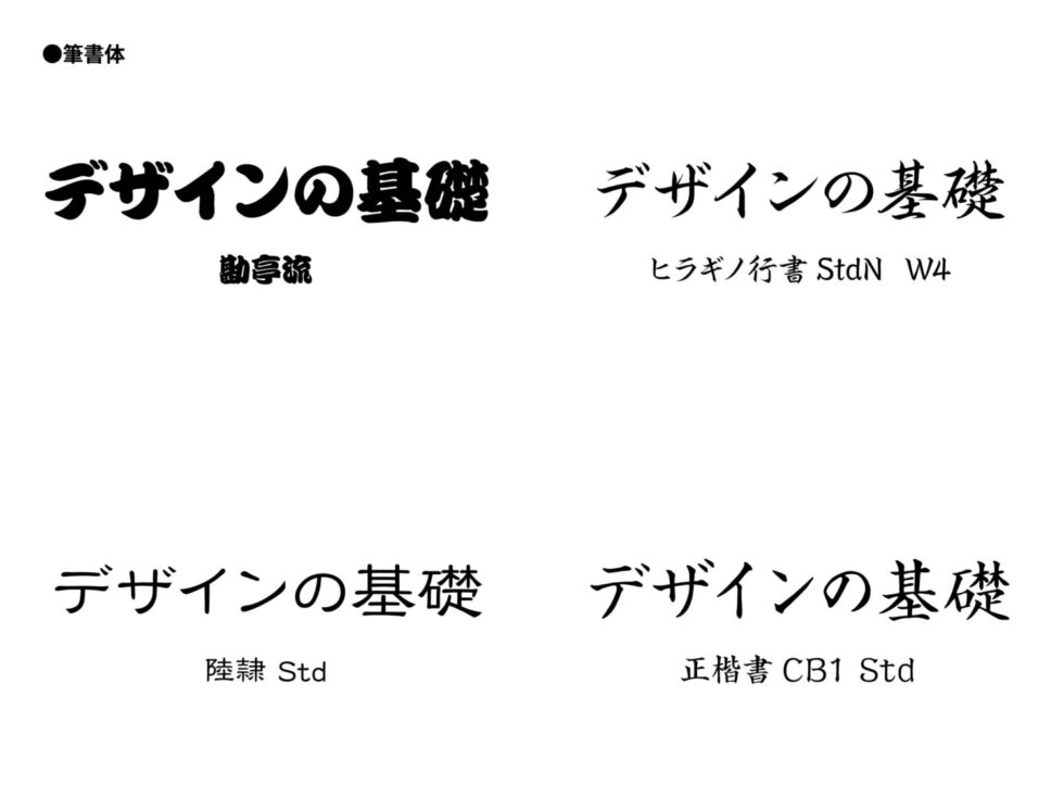 筆やペンで書いたような風合いを持つフォントです。「行書」「草書」「隷書」「篆書」「楷書」といったバリエーションがあり、それぞれで全然雰囲気が異なります。歌舞伎文字で使われる勘亭流は有名です。