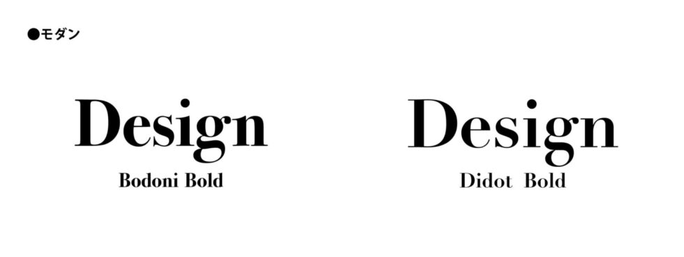 セリフ体と似ていますが、細い線はより細く、太い線はより太く、コントラストがはっきりしているのが特徴です。都会的でエレガントな雰囲気を持つフォントです。