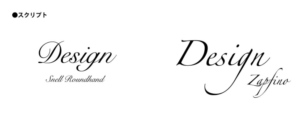 流麗な曲線を持つ、筆記体のような手書きのような印象を持つフォントです。デザインにアクセントをつけたいときに使われることが多く、「ここぞ」という時に使うと素敵な印象になります。長文で使うとほぼ読めません。