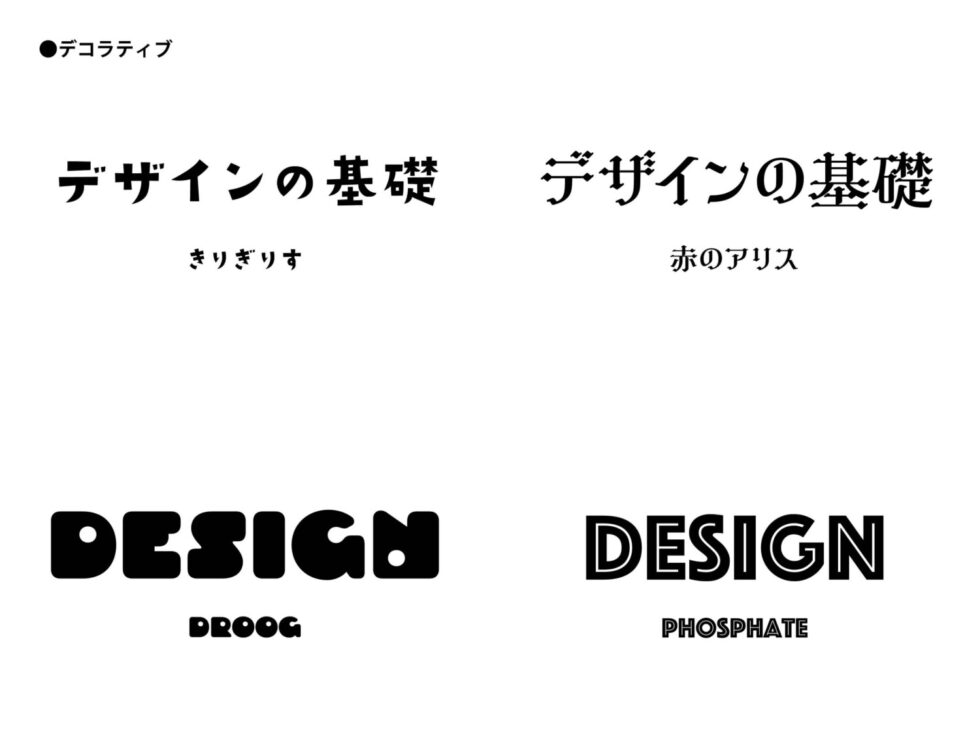 日本語、英語に共通で、上記に分類されない書体をまとめて呼びます。「ディスプレイ書体」「デザイン書体」と言ったり呼び方は様々あります。見た目にインパクトがあるものが多く、主に見出しとして使われます。